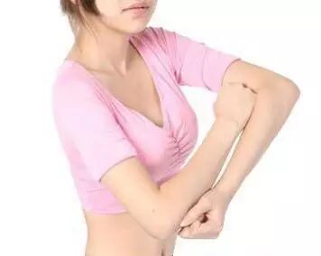 手肘弯曲,左手抬起来放在脑后,然后用右手按压左手肘关节,手掌稍微用力,顺着手肘往下推拿至腋下位置。持续按压20秒,然后换另一边按摩。