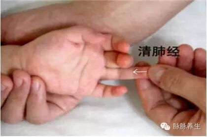 3)左手握住孩子的任何一只手,让他的手心向上,您用右手大拇指的螺纹面从孩子的无名指第二指间关节横纹推向指尖。也推49或81下。古人管这叫“清肺经”。力度不要太大,如果孩子皮肤太嫩,可以用鸡蛋清薄薄涂一下孩子的手臂再推。