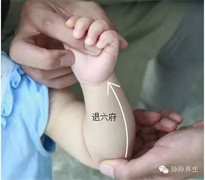 1)左手握住孩子的右手腕偏上一点点的地方,右手食指和中指的指腹沿着孩子的右前臂内侧正中——自腕横纹推至肘横纹,连推49下或81下。古人管这叫“清天河水”,这个简单的方法能很快退烧。