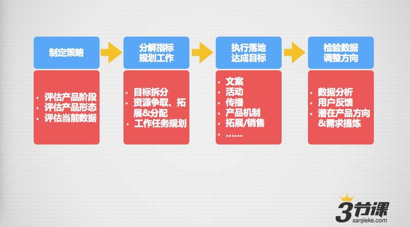 而一个能够真正“对产品负责”的运营,至少应该围绕着一款产品的生长完整经历过我们下面这张图上的每一个环节,并持续通过自己对于具体运营策略和手段的优化、调整获得过不错的产出。哪怕那个你所负责的产品,事实上只是一个QQ群或一个豆瓣小组。